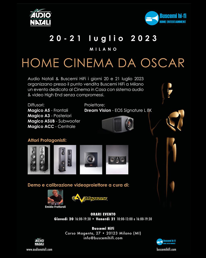 Unisciti a noi il 20 e 21 luglio 2023 presso Buscemi HiFi a Milano, dove organizzeremo un'evento imperdibile dedicato al Cinema in Casa con un sistema audio e video High End senza compromessi. Presenteremo la Serie A di Magico in configurazione multicanale con video proiettore Dream Vision EOS Signature L 8k.