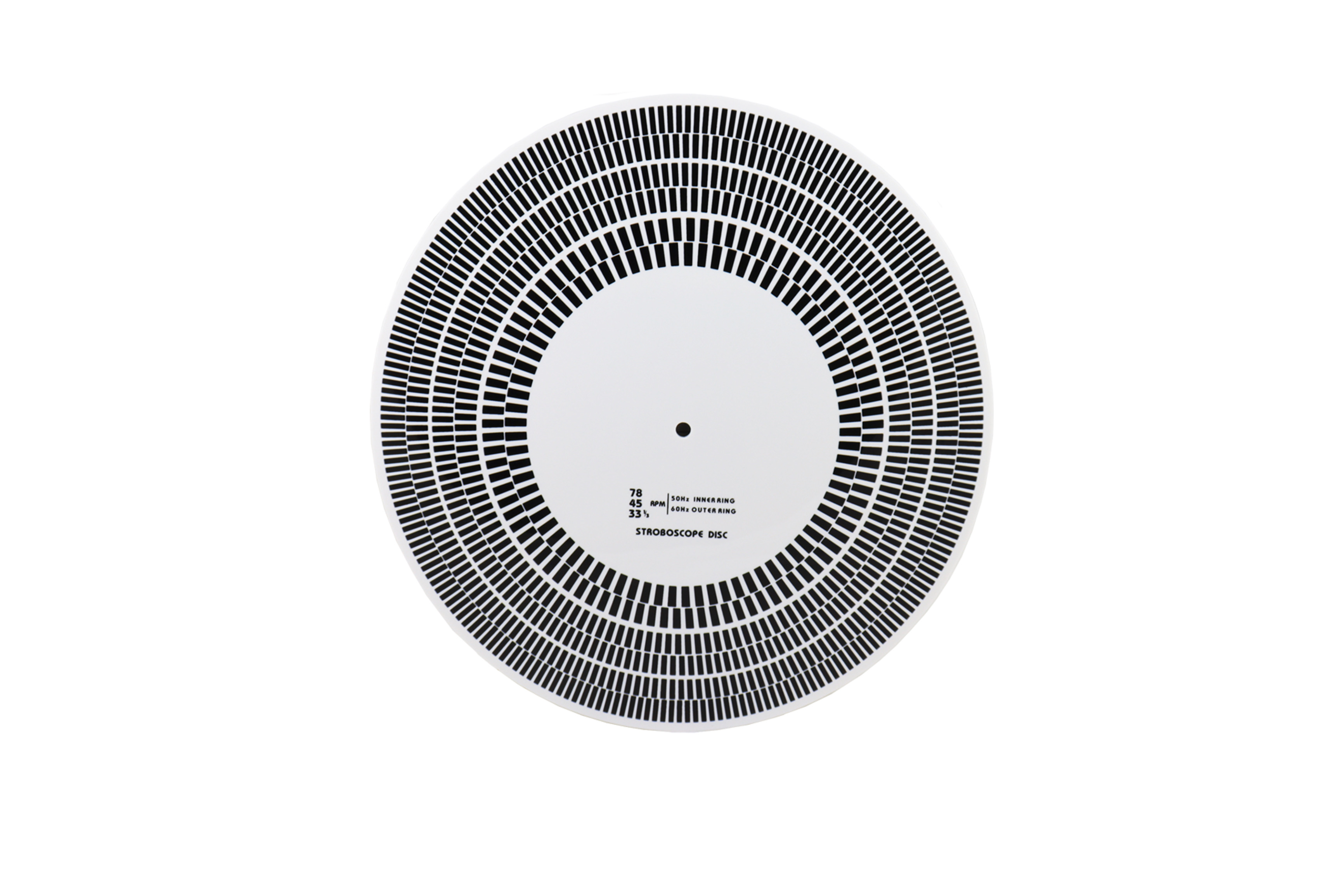 Lussuoso stroboscopio in acrilico trasparente su un lato con un modello di impostazione (goniometro) sull'altro lato. Per 33, 45 e 78 giri al minuto. Universale (adatto sia per 50 che per 60 Hz.).