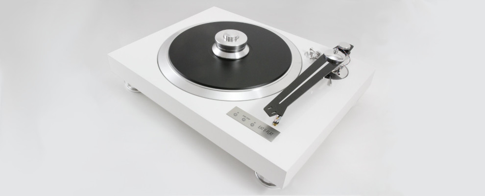 Il giradischi E-FLAT è disponibile nelle sequenti varianti: -E-FLAT standard                           -E-FLAT con testina EAT Yosegi   -E-FLAT con testina EAT Jo No. 5 L'E-Flat è l'innovativo giradischi EAT dotato di un rivoluzionario braccio a profilo piatto. (E-Flat sta per Mi Bemolle e Flat è anche l'aggettivo che significa "piatto" N.dT.). Il concetto di un braccio a profilo piatto non è nuovo in assoluto, ma quelli realizzati da altri competitors nel passato non offrivano la rigidità necessaria per una performance che fosse davvero allo stato dell'arte. Gli sviluppi della ricerca dei materiali, ed in particolare nella fibra di carbonio, hanno consentito al team di Forte di realizzare un braccio che presenta tutti di realizzare un braccio che presenta tutti i vantaggi di questo profilo senza gli inconvenienti ad esso associati. Compito dell'E-Flat è consegnare all'appassionato prestazioni al massimo livello in un design semplice ed accattivante. "Ultra piatto, ultra leggero e ultra rigido" questo braccio da 10" in fibra di carbonio è completato da una testina Yosegi MC. Un supporto unipivot sostiene l'E-Flat. Un ulteriore beneficio è la possibilità per l'utente di sostituire la parte tubolare del braccio in fibra di carbonio con altre di diverso peso per ottimizzare la risonanza del sistema di lettura nel caso di utilizzino testine con diversa massa. Non manca l'antiskating regolabile e l'abbassa braccio a discesa morbida.